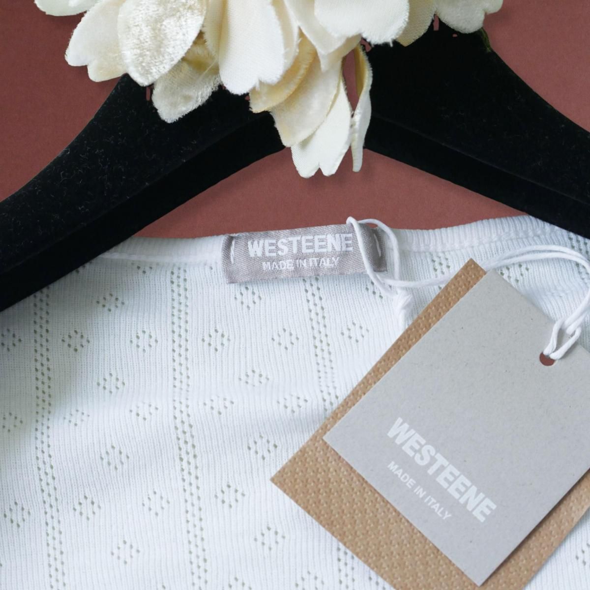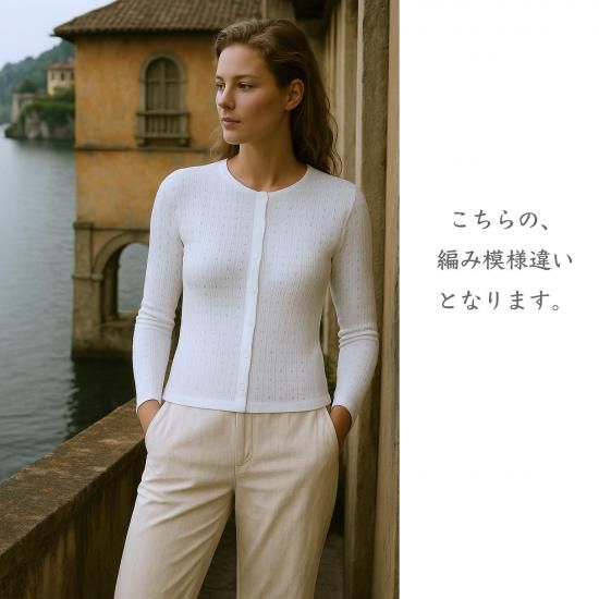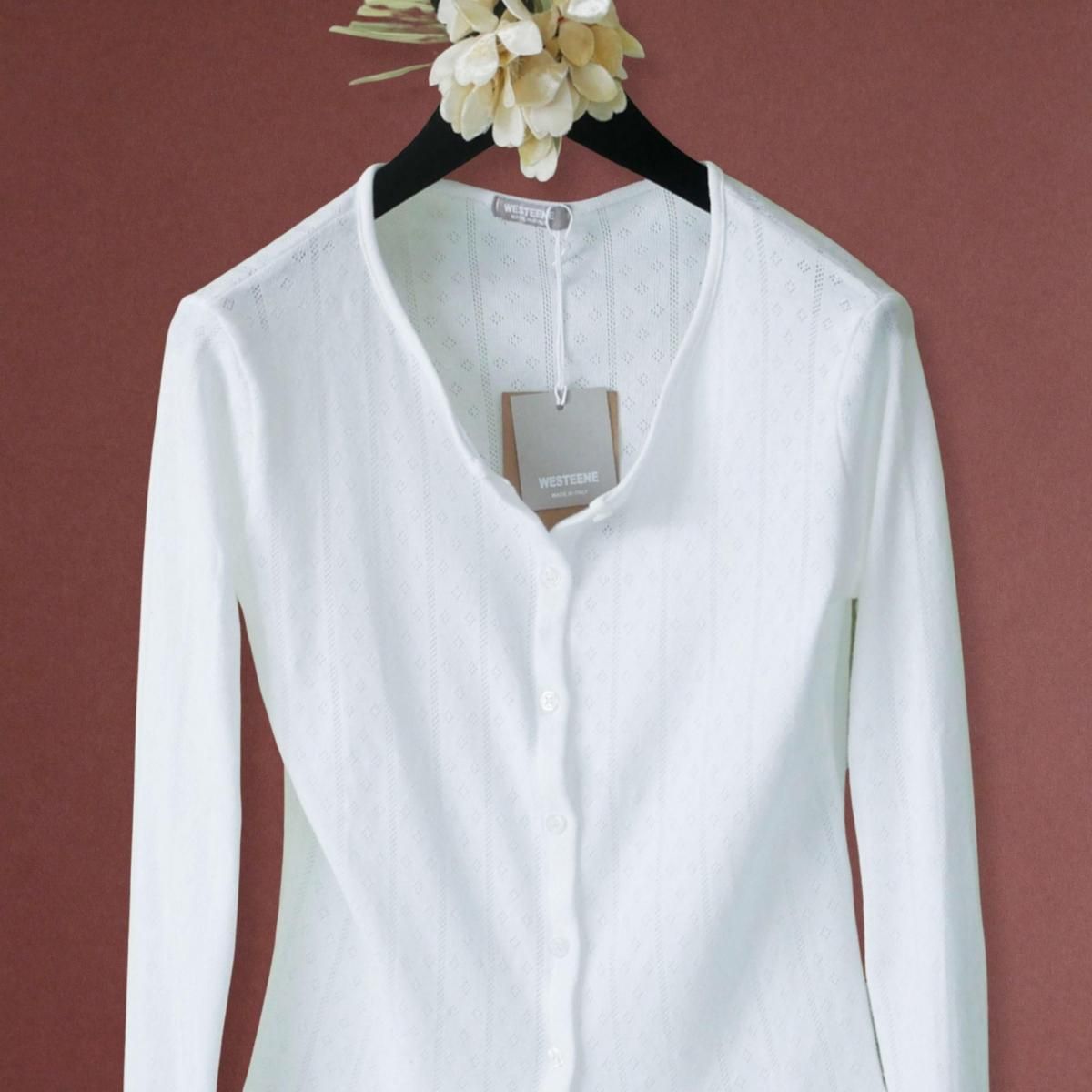 イタリアの新鋭ブランド WESTEENE「ウェステーネ」から登場した、洗練されたデザインのコットンニットカーディガン。繊細な透かし編みが施されたエレガントな表情が特徴で、シンプルながらも上品な一着です。