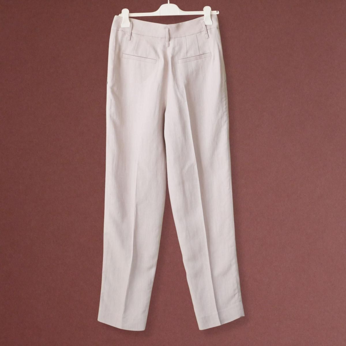 ●ややピンクがかったベージュトーンが、柔らかく女性らしい印象を与えるストレートパンツ。無駄を削ぎ落としたクリーンなデザインながら、タックを施すことでヒップラインにゆとりを持たせ、美しい縦のシルエットが引き立つ仕上がりとなっております。センタープレスが施されており、リネン混のナチュラルな素材感の中に、端正な佇まいが感じられます。