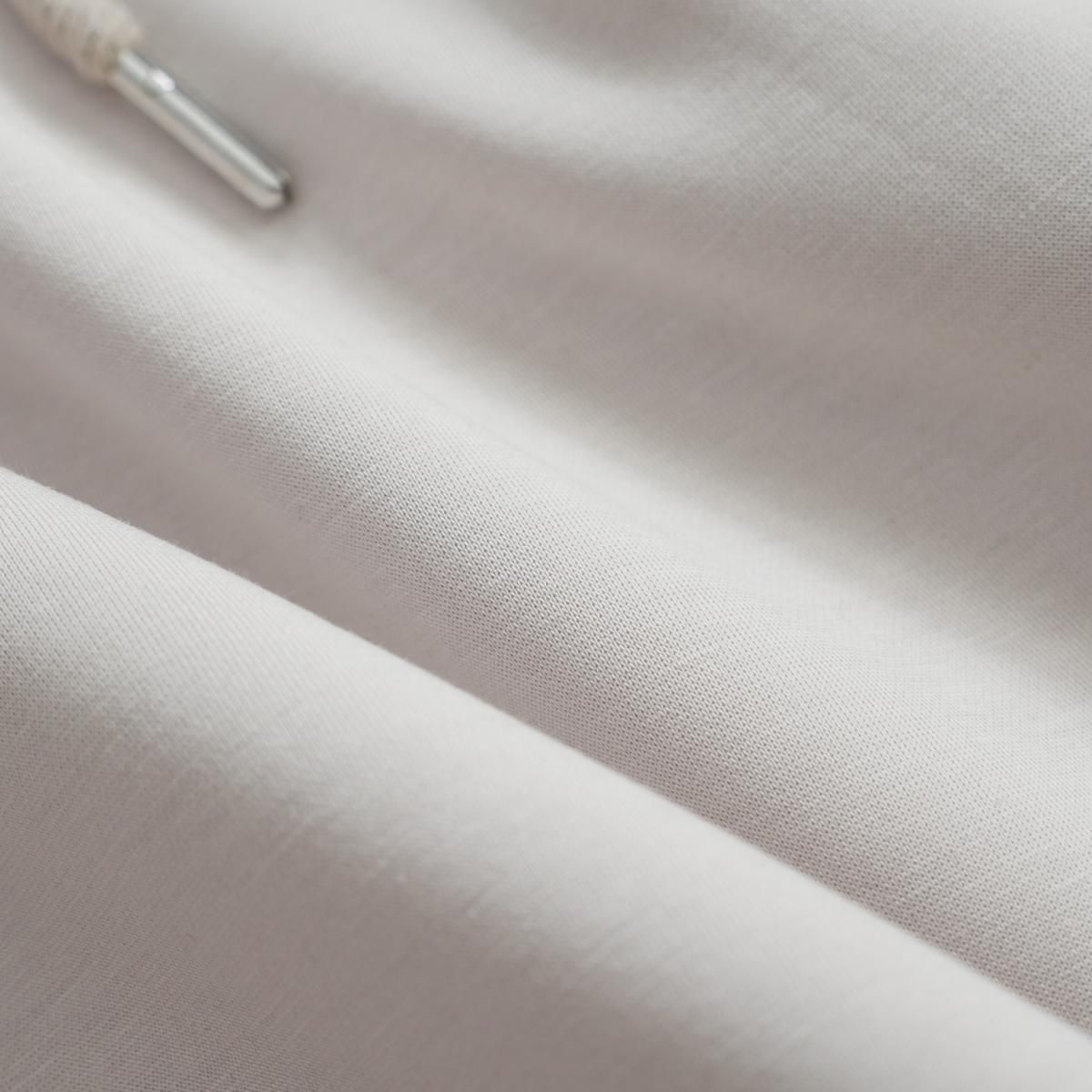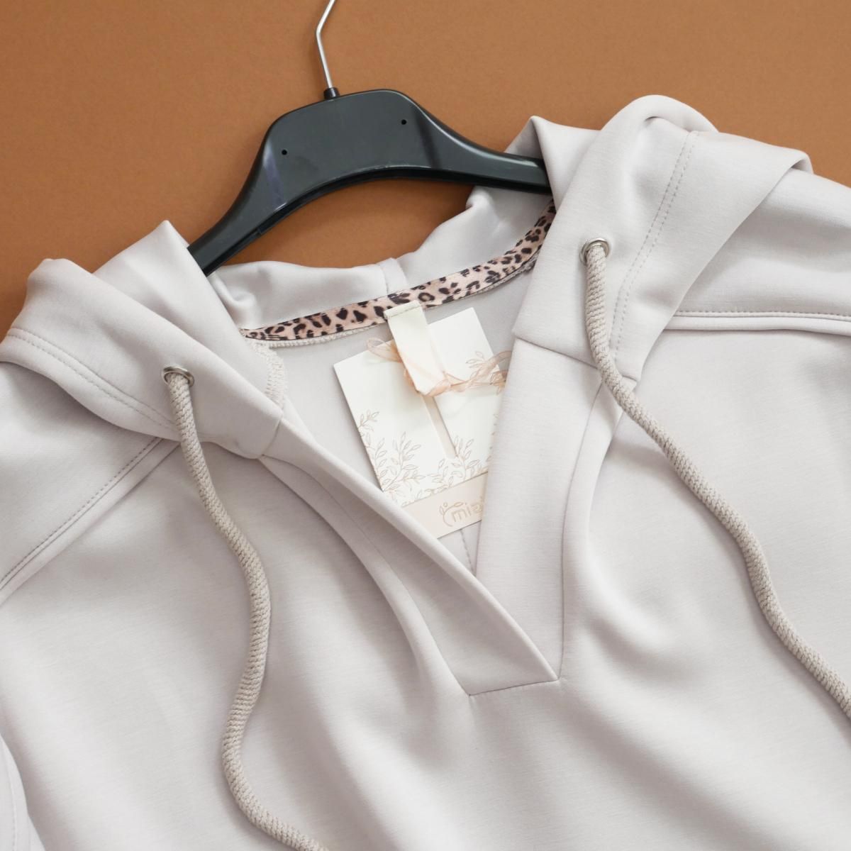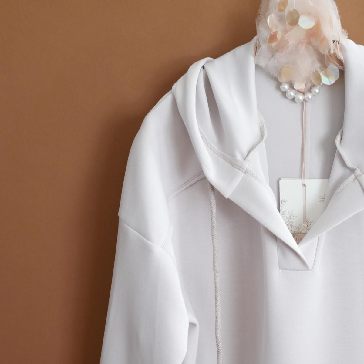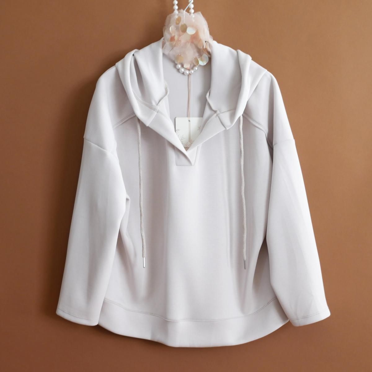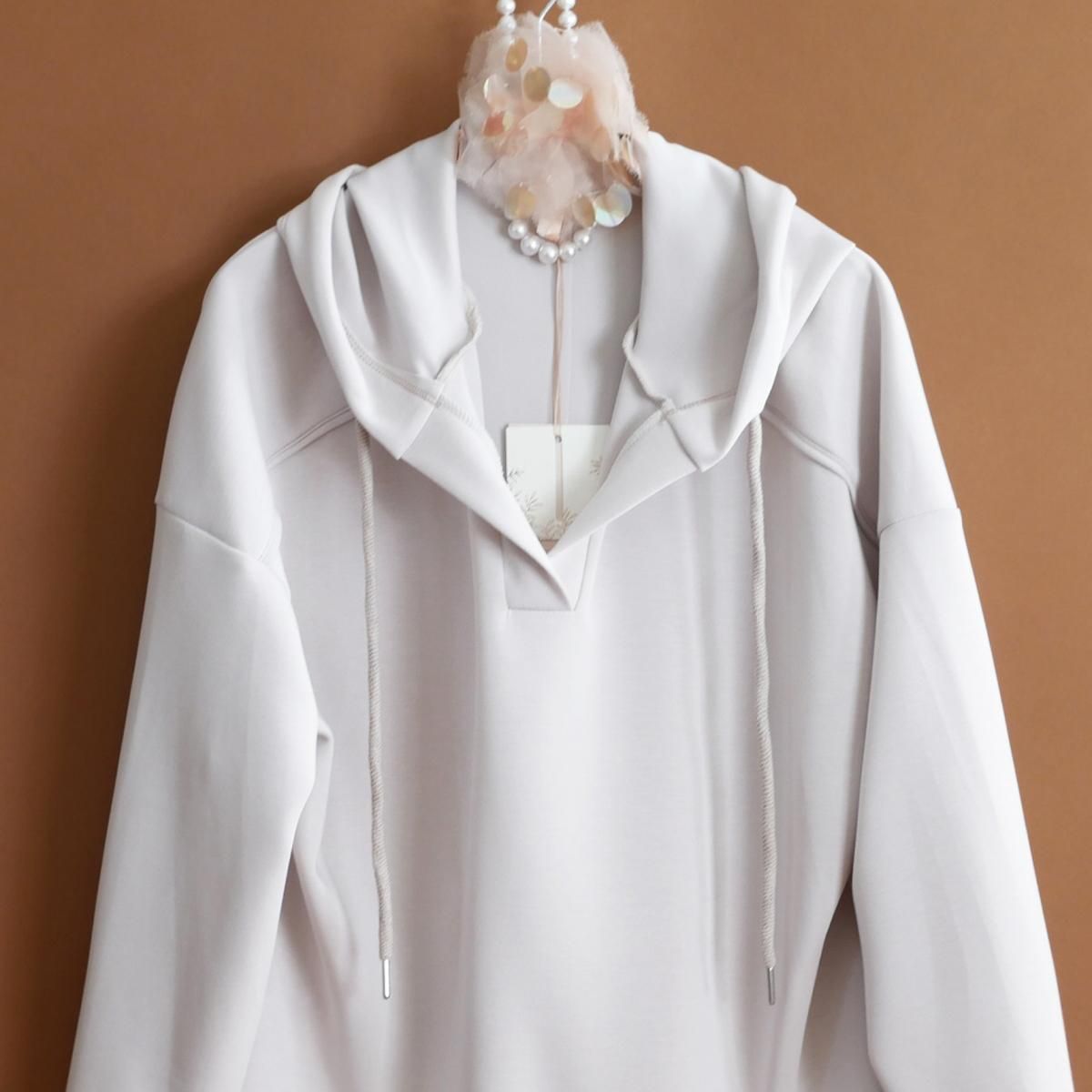 ●深めのVネックラインが女性らしい抜け感を演出し、フードのドローストリングやラグランスリーブによってリラックス感もありながら、都会的で上品な表情を保ちます。軽やかな着心地を叶える生地は、柔らかなビスコースをベースに、エラスタンの伸縮性をブレンド。動きやすくストレスフリーな着用感を実現いたします。