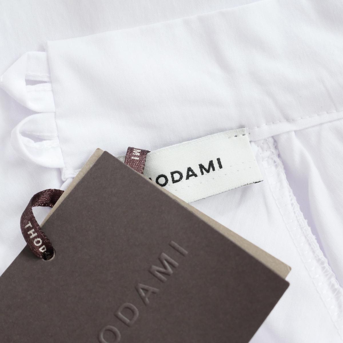 襟元は後ろに二つのボタンを配し、上品でありながらも着脱が容易な仕様です。オーバーサイズのみのアジアンファッションとは異なり、全体的に優雅な現代的モードの流れを汲みつつ、抑えるべきところは抑え、大人女性がお楽しみいただけます、新鋭ブランド「トダミ Made in Italy」らしい仕上がりのお一品でございます。