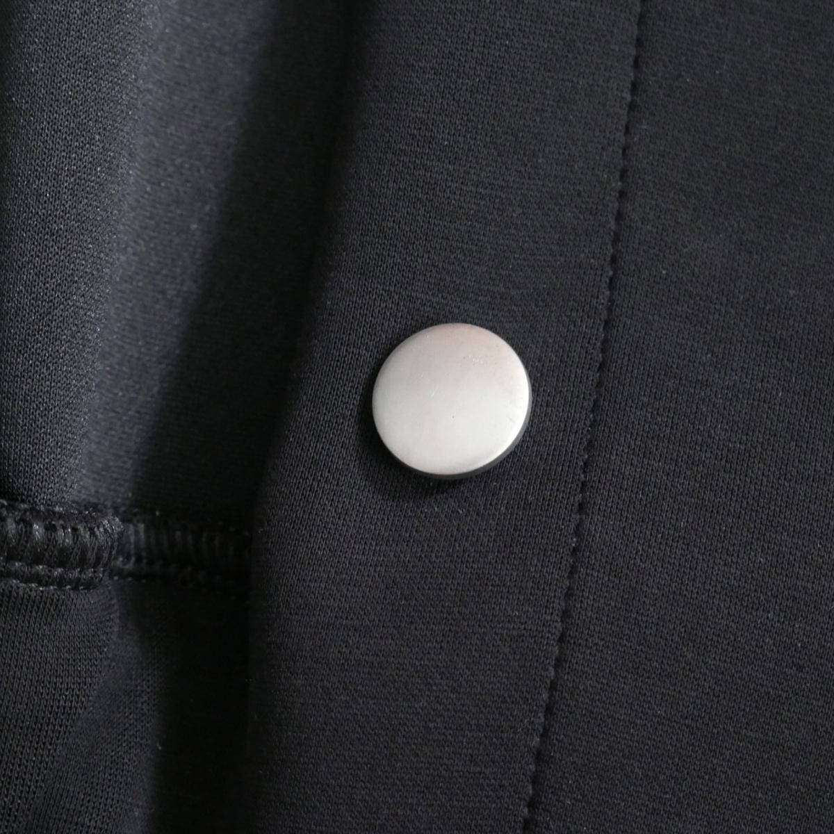 ●襟元は上品なスタンドカラー仕様、フロントにはマットな質感のスナップボタンを配し、クリーンでモダンな印象を演出。両サイドにはポケットがあり、実用性とデザイン性を兼ね備えています。裾と袖口にはさりげないギャザーが入り、女性らしいやわらかな丸みを引き出しております。