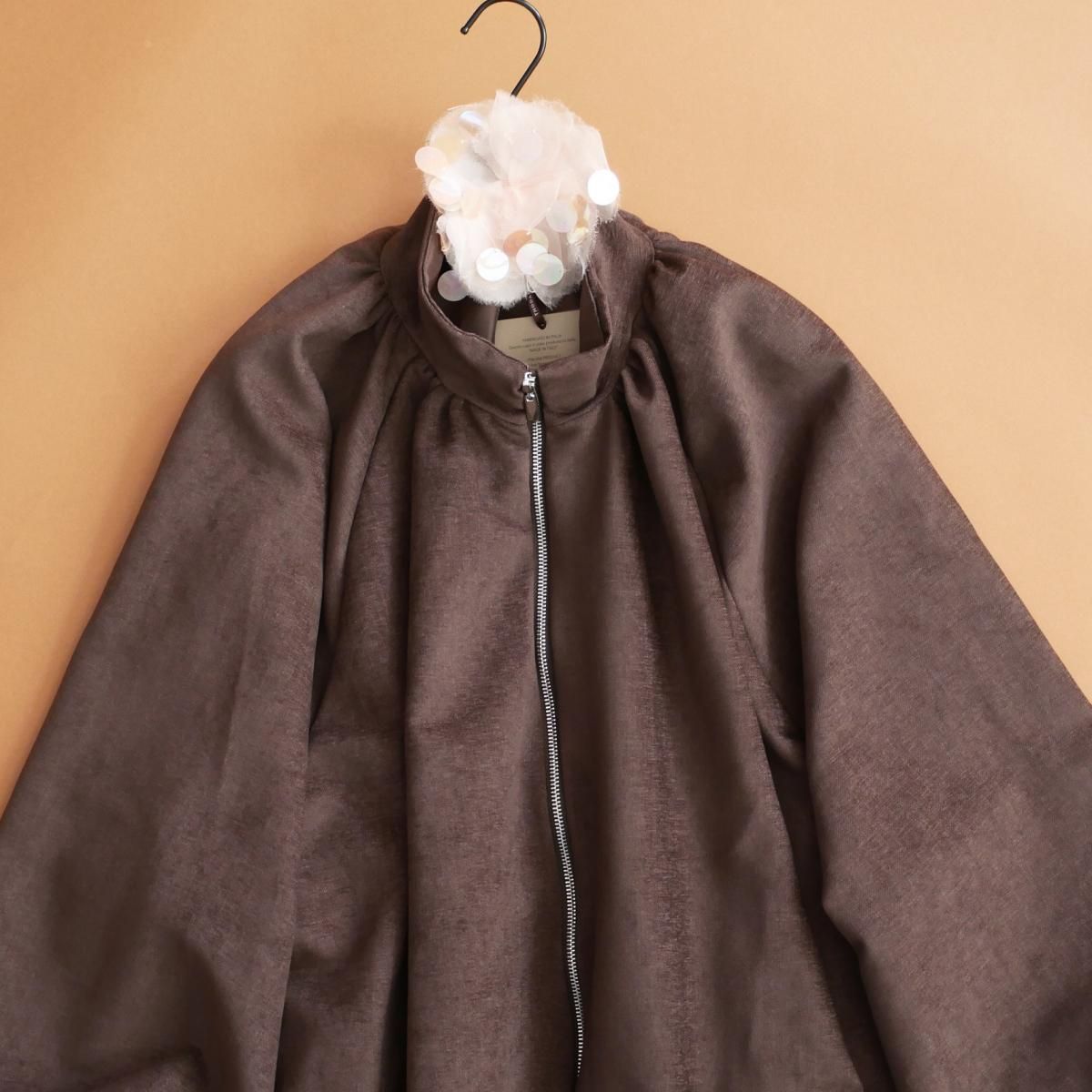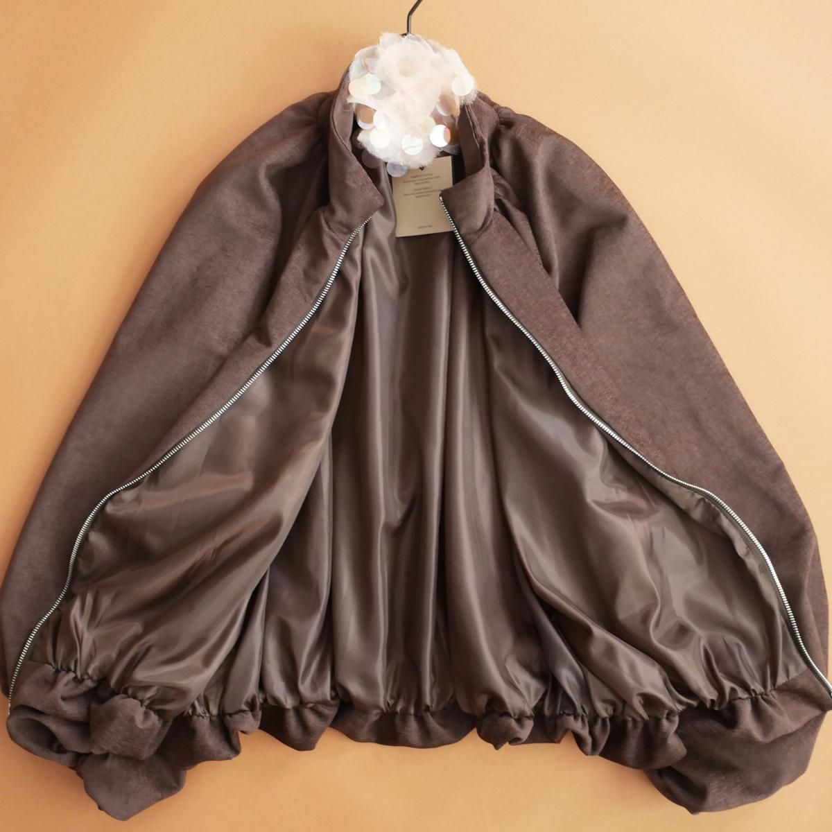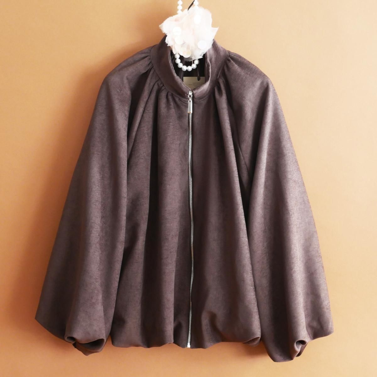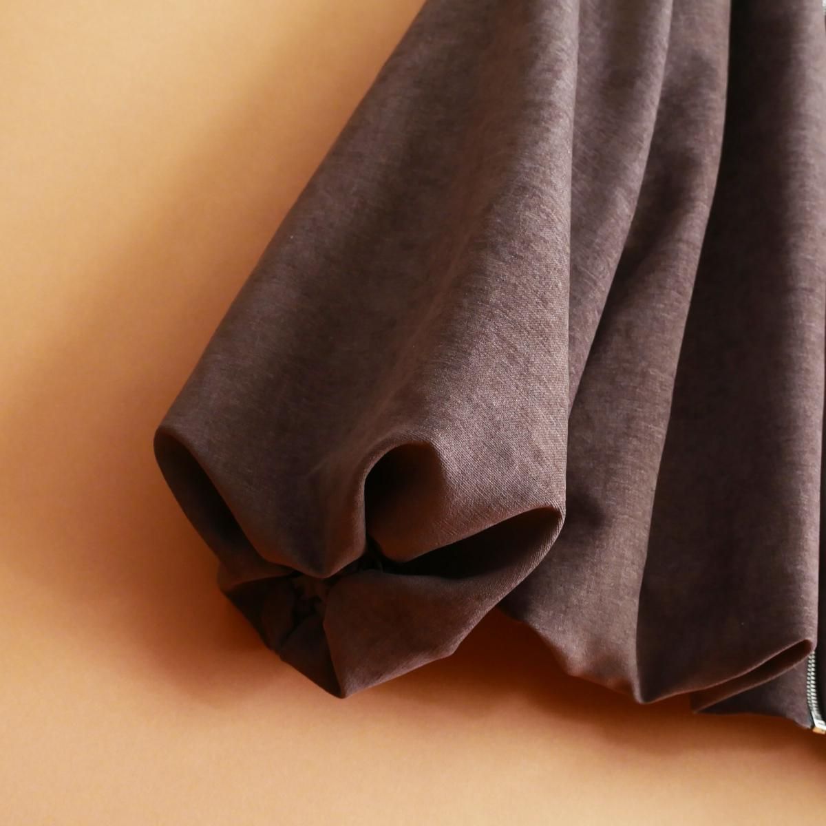 ●たっぷりとしたボリュームスリーブと裾の丸みが生み出すバルーンフォルムが、優雅で洗練された印象を演出いたします。 ふんわりと空気をはらむような立体感がありながらも、全体のシルエットは計算されたコンパクトな丈感で、大人の女性にふさわしい上品なバランスに仕上がっております。 ネックラインを包み込むように仕立てられたスタンドカラーが、首元をすっきりと見せ、ファスナーの輝きがモダンなアクセントとなっております。