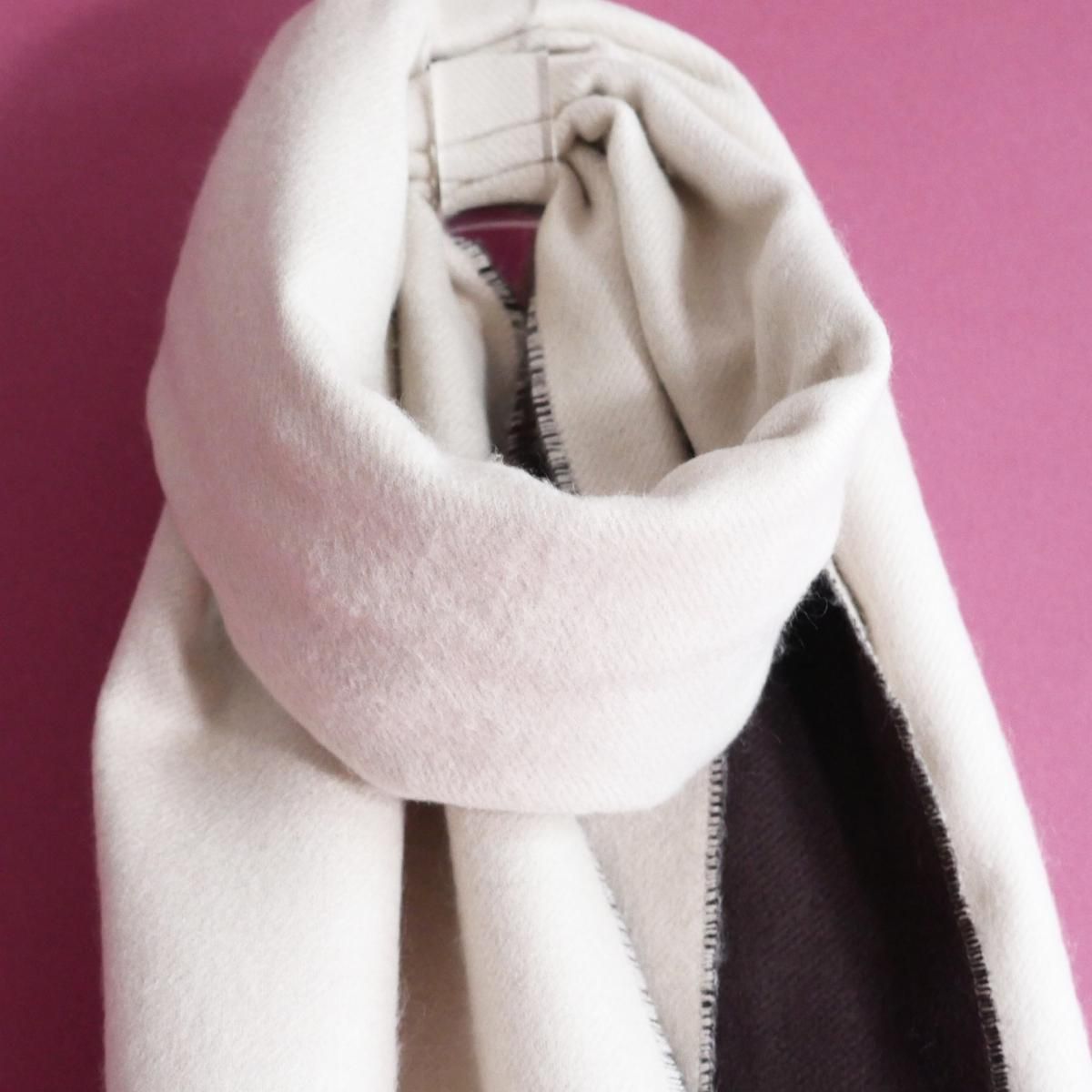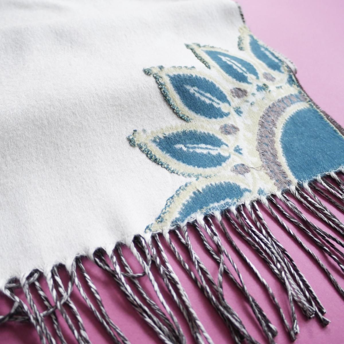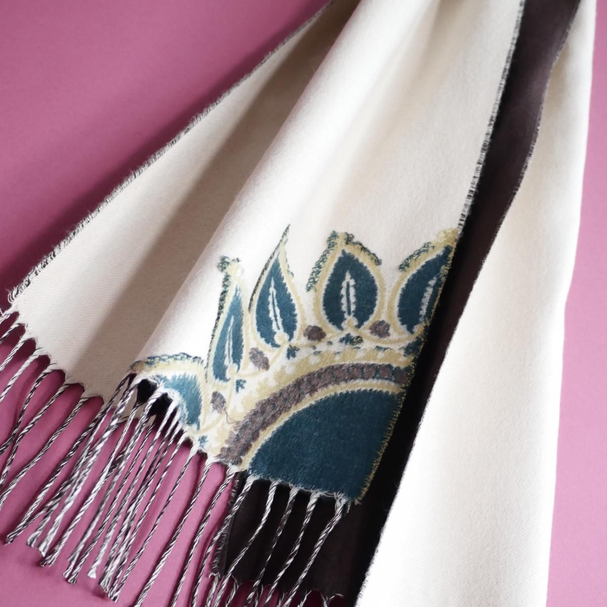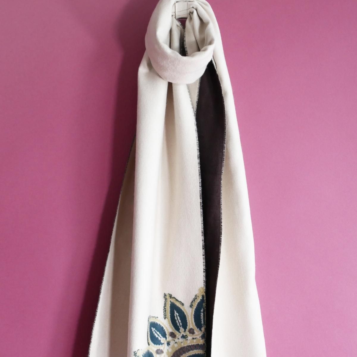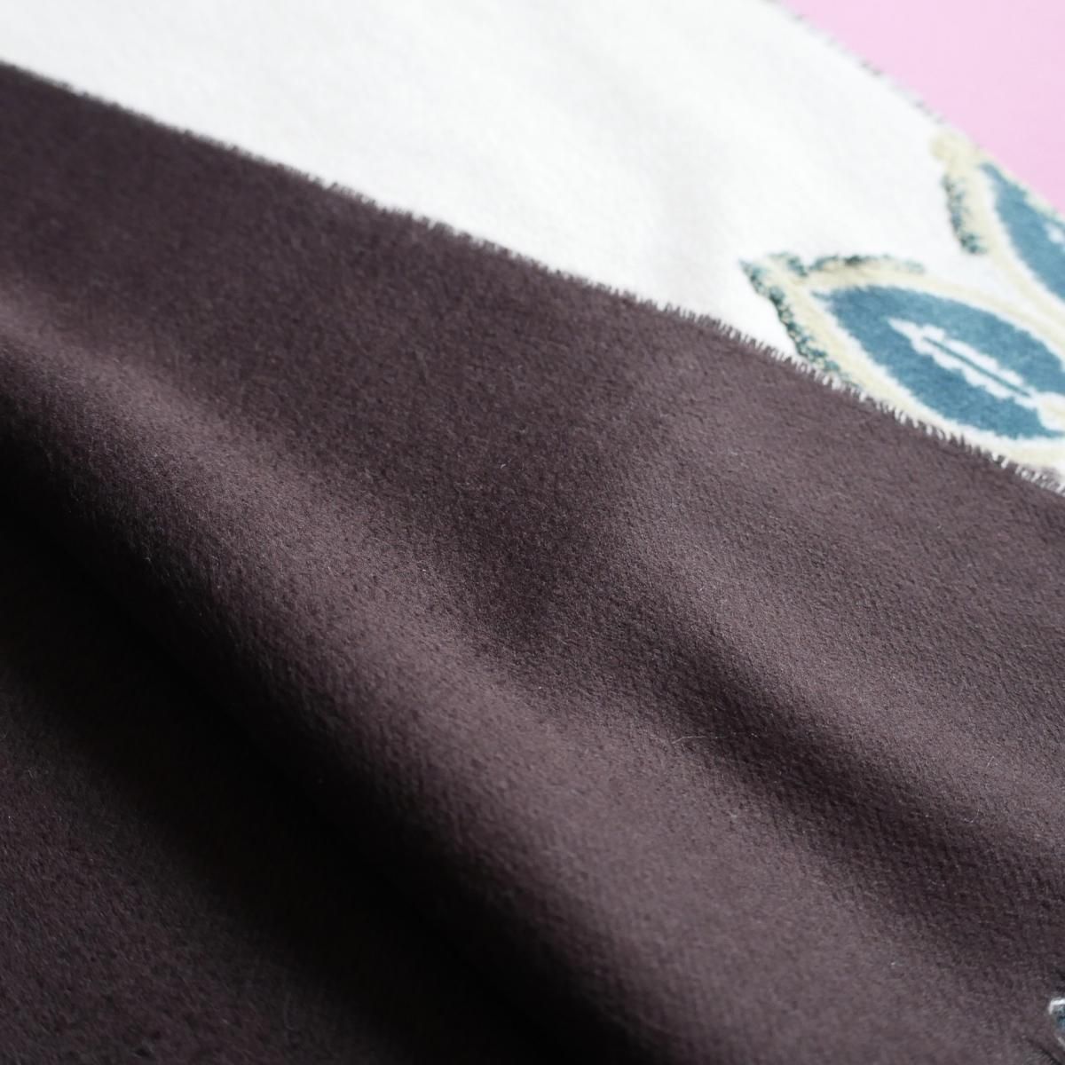 ●表面はやわらかなリッチパンナ系、裏面は深みのあるディープブラウン系のリバーシブル仕様。端に施された繊細なフリンジと、美しいボタニカルモチーフの刺繍がアクセントとなり、イタリアらしい芸術的感性が息づいています。巻き方によって表情を変えられるため、コーディネートの幅も広がります。