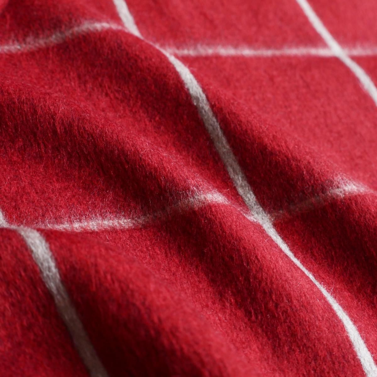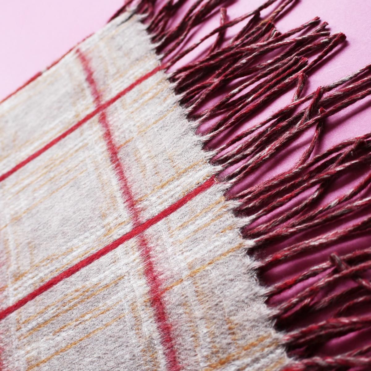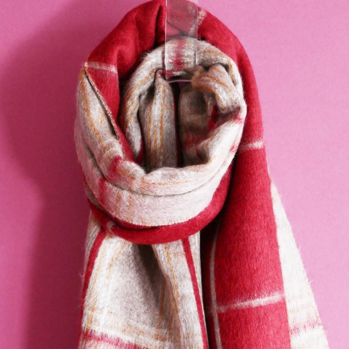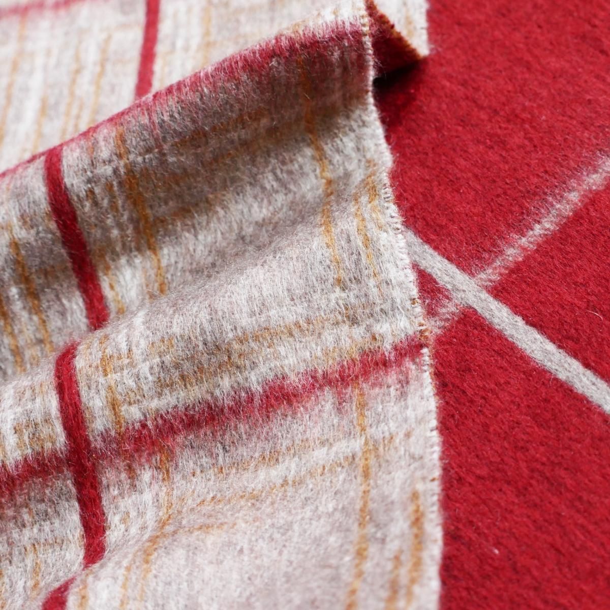 ●鮮やかなレッドと、柔らかなベージュトーンを組み合わせたチェック柄が印象的なデザイン。クラシックでありながらモダンな色調のバランスが美しく、巻き方によって異なる表情をお楽しみいただけます。両端にはツイストフリンジをあしらい、細部に至るまでピアチェンツァらしい丁寧な仕立てが光ります。