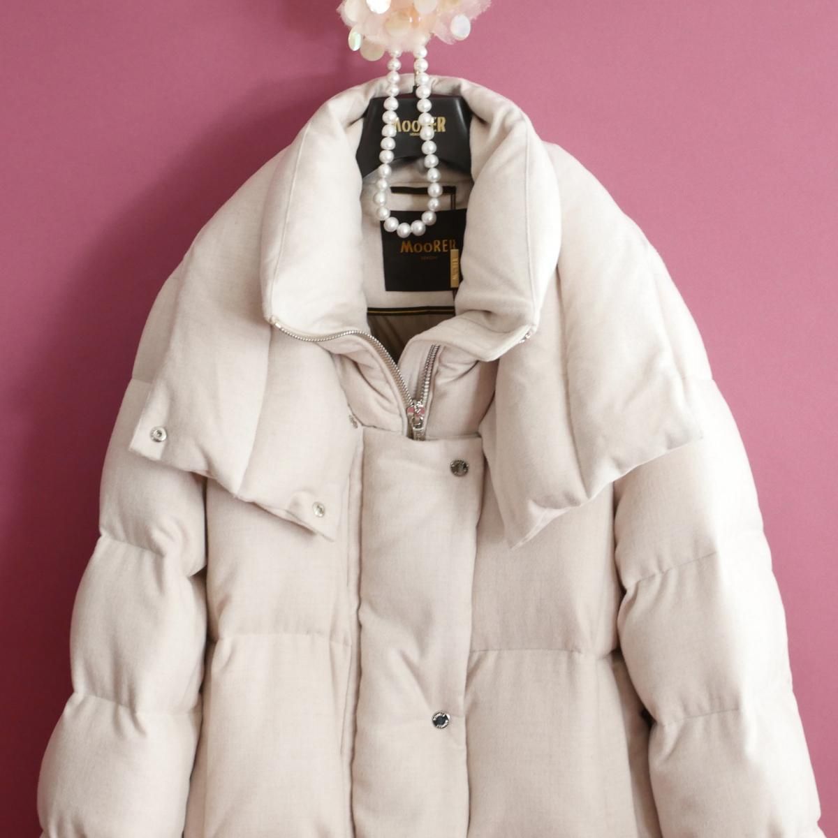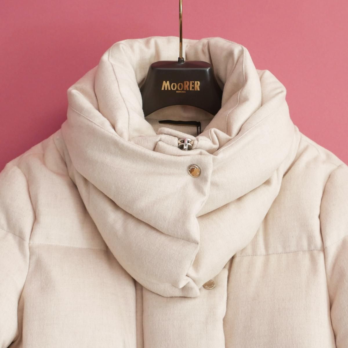 ●イタリアのプレミアムラグジュアリーブランドMooRER(ムーレー)より、カシミヤ混の上質素材を贅沢に使用したレディース用ダウンジャケットでございます。ふんわりとした空気を含むような軽やかさと、ムーレーならではの凛とした佇まいが調和し、冬の装いをしっとりと優雅に引き立ててくれます。ムーレーのカシミヤやウールフランネル生地は、ロロピアーナ生地を使用していますので、上質さこのお上なしな触り心地をお楽しみいただけます。貴重な今季の現在ブランドのホームページにも掲載されている、美しいモデルのお一品です。まるでファーを纏っているかのようなリッチな雰囲気は、今季の、とっておきの一着としていただけそうでございます。