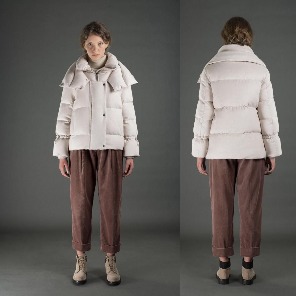 ●表地には、ウールとカシミヤを贅沢にブレンドした生地が使用され、しっとりとなめらかなタッチが女性らしい繊細さを添えています。マットで上質な素材感が、ダウン特有のカジュアル感を抑え、柔らかく上品な雰囲気を演出しています。立体的に仕立てられた大きめの襟は、首元をやさしく包み込みながら、ふわりと華やぐシルエットを描き、顔まわりを美しく魅せてくれます。